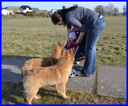 Auf dem Spaziergang heute haben wir diese junge Frau mit ihrem Kind getroffen. Sie war ganz begeistert von Filippa und Farouche, ja und meine Beiden fanden die Leute auch sympatisch! |