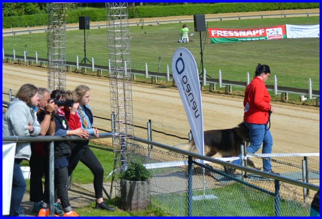 Nach unserem Lauf zog ich mit der Kamera inder Hand los, um ganz viel von dieser Veranstaltung in meinen Fotos festzuhalten. Ich schaute mir die Läufe in den jeweiligen Klassen an, fieberte mit, drückte die Daumen, holte mir Anregungen für meine eigene Arbeit, freute mich mit den Startern wenn sie gut gelaufen waren, und motivierte, wenn es doch nicht so gut war! Was ich klasse fand, alle Ergebnisse wurden immer sofort über Lautsprecher bekannt gegeben und immer war Musik dabei, was dem Ganzen einen schönen Rahmen gab. Auf dem Gelände gab es auch jede Menge Händler, die hatten Futterbedarf, Leinen, Halsbänder, usw, eben alles was ein Hundeherz bzw. Frauchens Herz erfreut! Selbst ein Profifotograf war vor Ort, der mit vielen Hunden ein Fotoshooting machte, mit Canis natürlich auch! Auch für das leibliche Wohl war bestens gesorgt, es fehlte an nichts!