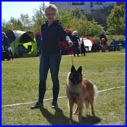 Richterbericht: 9 Monate, Scherengebiss, größere Hündin, quadratisch mit femininem Kopf, es fehlt an Stopp, Ohren vorzüglich getragen, dunkelbraune Augen, korrekte Halslinien, vorzügliches Fell von Qualität und Farbe, korrekte Winkelungen vorne und hinten, gerader Rücken, flüssige Bewegungsabläufe, zeigt sich freundlich, gute Vorführung.