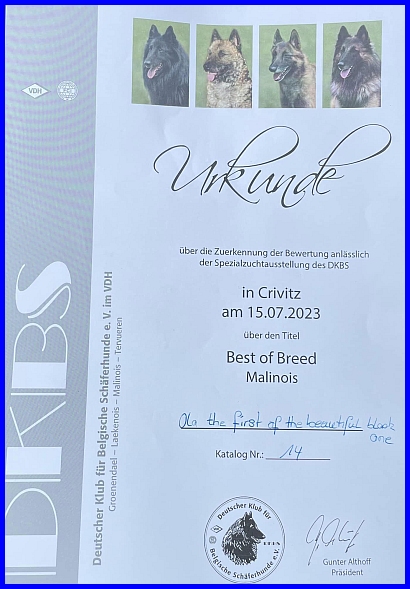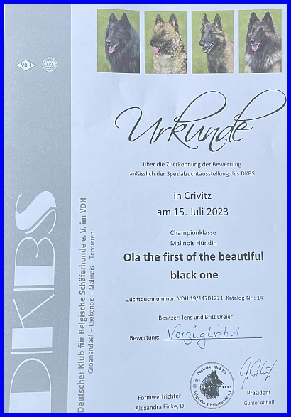 Auf der DKBS Speziale in Crivitz hat Ola wieder voll abgeräumt, bekam von der Richterin Alexandra Finke V1, Anw. Dt. Ch. VDH, CAC, Beste Hündin, und das BOB! Irre, ich freue mich riesig für Euch!