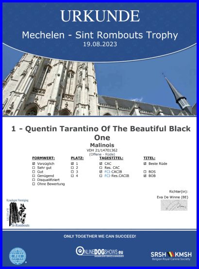 Sieben Wochen später wart ihr erneut in Belgien, in Mechelen, da erhielt Quentin von der belgischen Richterin Eva de Winne auch V1, CAC, CACIB, Bester Rüde und das BOB. Was für ein Erfolg!