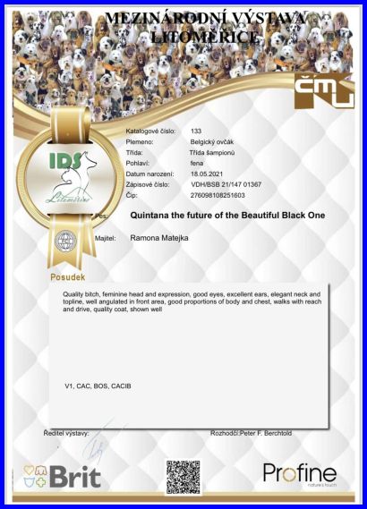 Quintana ihr erster Auslandsauftritt war am 25.05.2024 in Litomerice in der Tschechei. Fast auf den Tag genau vor fünf Jahren war ich mit ihrer Mama Akela in Litomerice, die damals alles gewonnen hat. Und nun hat mich Quintana ebenfalls total überrascht, unglaublich, sie hat auch alles gewonnen und dann hat sie auch noch das BOS erhalten!!! Ich bin mega stolz auf auf meine kleine Quintana!!! Sie macht es ihrer Mama nach :-)