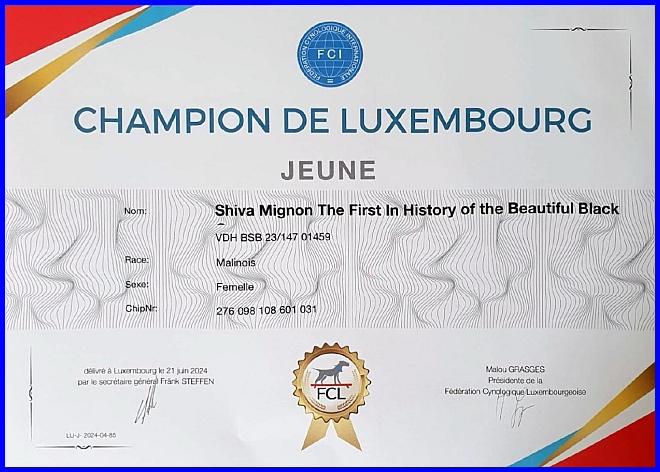 Am 21.06.2024 erhielt Shiva offiziell den Titel "Luxemburger Jugend-Champion"! Zwei Wochen vorher hatte Shiva schon den Titel "Deutscher Jugend-Champion VDH" erhalten, ich bin mega stolz auf Euch!!!
