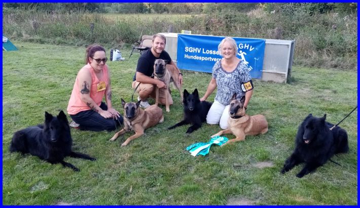 Danke, Sabine, Bianca und Sebastin, dass ihr noch für ein Bild mit mir und meinen Hunden dageblieben seid! Von links nach rechts: Nelly of the BBO, die leider nur Zuschauer war - die Schwester von Viktoria; Bianca mit Olivia, Sebastin mit Hero, Ich mit Viktoria und Mama Akela, und rechts außen Helena of the BBO mit ihrem Frauchen Sabine, die leider nicht zu sehen ist, aber die Leine hält. :-)