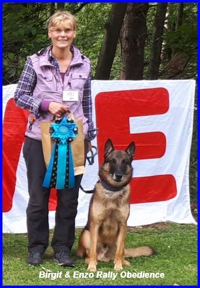 Birgit war mit Enzo auf den unteschiedlichsten Seminaren, hat mit ihm immer viele verschiedene Fun Sportarten gemacht, wie Trick Dog, Longieren, Frisbee usw. Im Obedience hat Birgit Enzo bis in Obi 2, geführt. Seit ca. 3 Jahren laufen sie im Rally Obedience erfolgreich Turniere, starten hier schon in der Königsklasse RO3. Hier sind einige Momentaufnahmen von Birgit und Enzo. Ich bin sehr stolz auf Euch Beide!!!