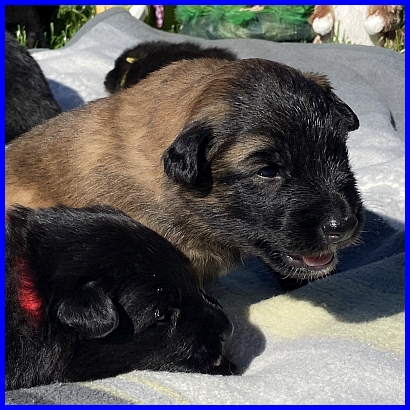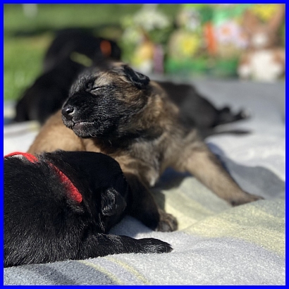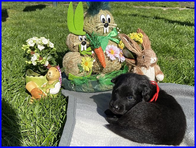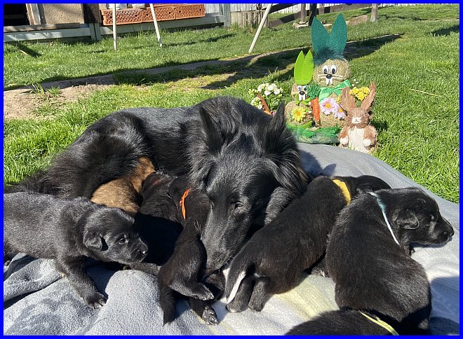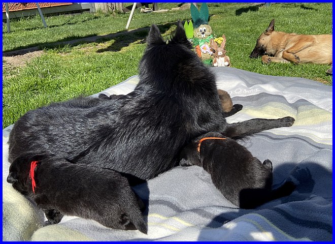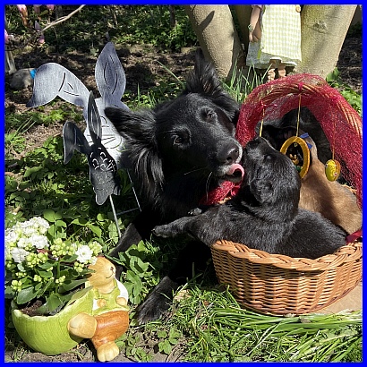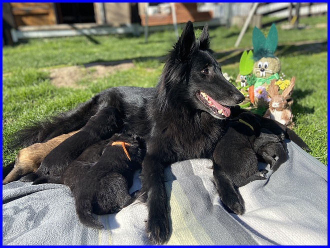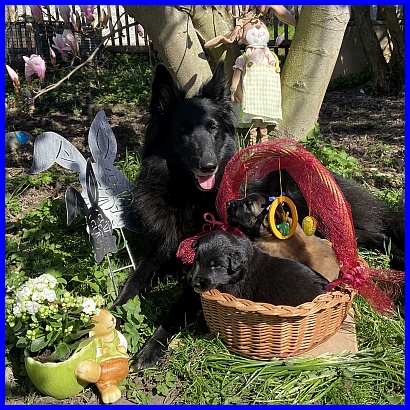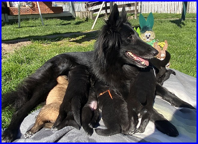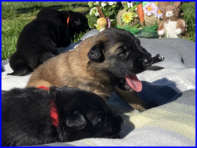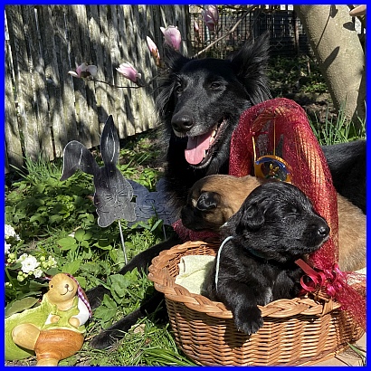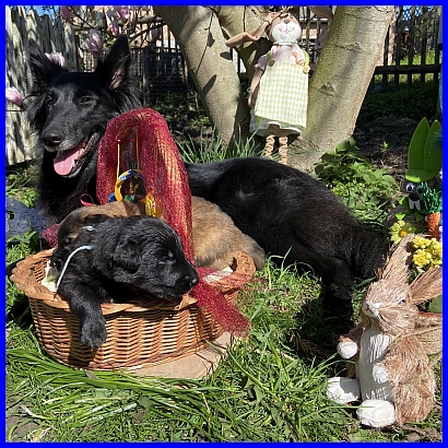 Für das Osterbild durften Rüde Blau und mein Tervuerenrüde ein wenig posieren, sie waren noch nicht so müde wie ihre Geschwister. |