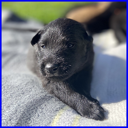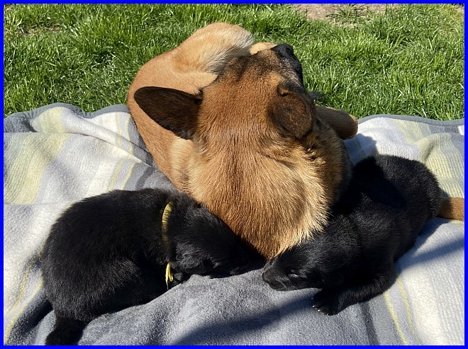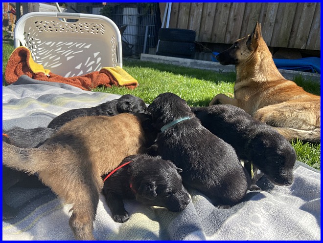 Viktoria meint, es reicht nun, die Babys müssen wieder rein in ihre Wurfkiste zum Schlafen. Ein ganz diskreter Hinweis auf das Welpenmobil, guck, Frauchen, damit schaffst Du die Knirpse ins Haus!!!
