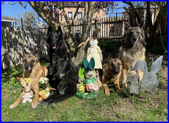 Zum Abschluß musste natürlich noch ein Osterbild mit allen meinen Mädels sein! Von links nach rechts Mali Akela, Viktoria sitzend, Gröni Oma YooPee, Mali Quintana und rechts außen sitzend meine Tervuerendame Farouche.