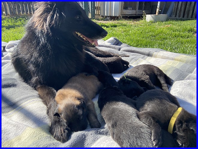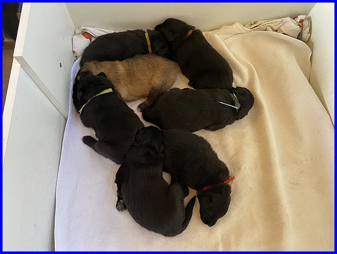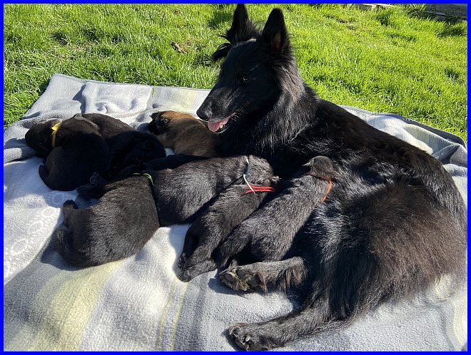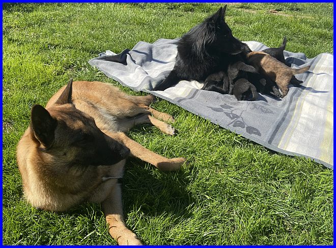Vicky und ihre sieben Zwerge! Mein kleiner Farbklecks, der Tervueren Bub, liegt gut versteckt in der Mitte :-) |