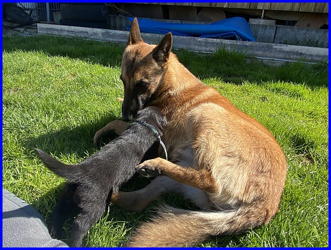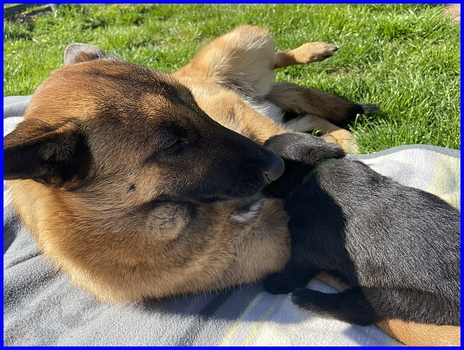 Richtig wohl fühlt sie sich noch nicht, aber das kommt bald. Sie wird das Kindermädchen, darf dann immer mit den Welpen spielen.
