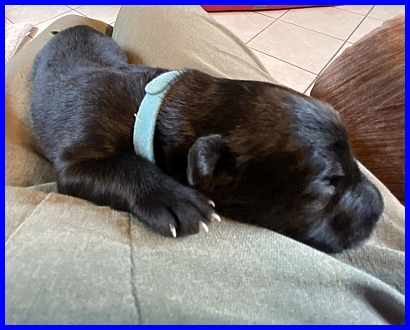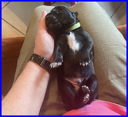 Mr. Grün hat sein Geburtsgewicht als erster verdoppelt, wiegt 806g und ist damit der zweitschwerste Welpe. |