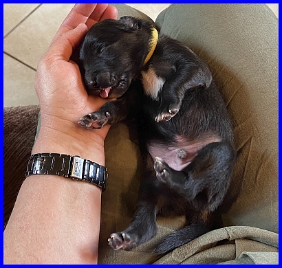 Am 05.04.2022 waren meine kleinen Rohdiamanten schon eine Woche auf der Welt, hatten 1. Woche Geburtstag. Klar mussten da Fotos gemacht werden! Viktoria ihre Babys entwickeln sich prächtig. Natürlich verbringen sie die meiste Zeit mit schlafen und trinken, es passiert noch nicht viel in der Wurfkiste. Rüde Grün hatte pünktlich zum 1. Woche Geburtstag sein Geburtsgewicht verdoppelt, alle anderen Welpen hatten einen Tag später ihr Geburtsgewicht verdoppelt. Es ist Viktoria ihr erster Wurf und sie zeigt sich als eine sehr entspannte und liebevolle Mutter, sie versorgt die Babys sehr gut. Ich bin gespannt, wie sie die Welpen erzieht. Vicky ist eigentlich selber noch ein übermütiger Troll, hat viel Unfug im Kopf, das wird spannend! ;-)