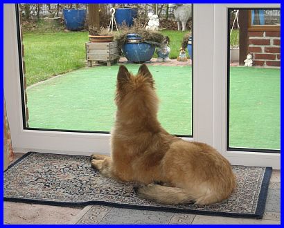 Es regnet und ich "will" raus! War keine so tolle Idee, hab Frauchen zwar überzeugt, und wir drei hatten auch echt viel Spaß, aber danach war saubermachen angesagt, das ist dann nicht mehr so lustig! Ach ja, ich bin hier schon 20 Wochen alt. |