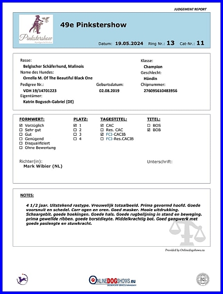 Am 19.05.2024 wart ihr mit Elli das erste Mal in Holland auf der Pinkstershow. Dort bekam Elli von dem holländischen Richter Mark Wibier das V1, CACIB, CAC und das BOB! Klasse, ich freu mich riesig für Euch, das erste ausländische CACIB für den Internationalen Champion!!!
