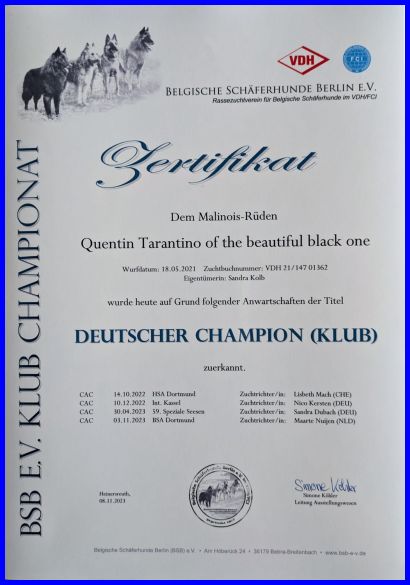Am 08.12.2023 erhielt Quentin offiziell den Titel "Deutscher Champion (Klub) BSB "!