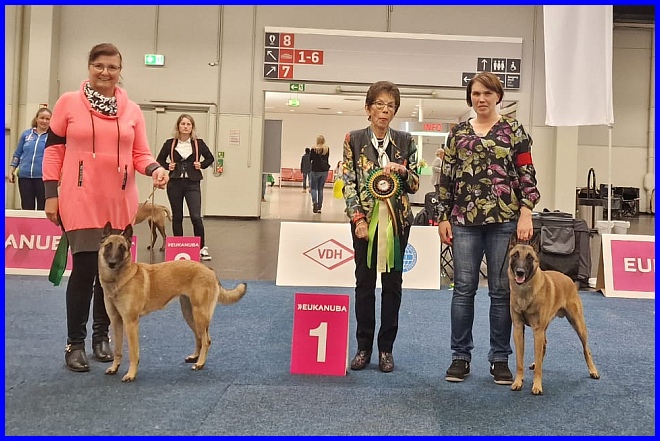 Zwei BBO`s die besten Malinois in Dortmund, Quentin BOB ( Best of Breed-Bester der Rasse)und Ornella BOS (Bester des anderen Geschlechts-Best of Opposite Sex), mit der Richterin Frau Mach.