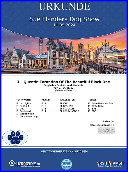 Im Mai 2024 wart ihr wieder auf der Int. Ausstellung in Gent, auf der Flanders Dog Show, und Quentin bekam von dem Richter Jean - Jaques Dupas aus Frankreich V1, CAC, CACIB, Bester Rüde und das BOB, irre!!!