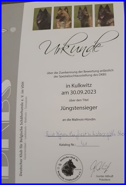 Shiva´s zweite Ausstellung war auf der DKBS Herbst Speziale in Kulkwitz. Shiva hat von der Richterin Meike Krug VV1- vielversprechend und den Titel Jüngstensieger bekommen, ganz herzlichen Glückwunsch!